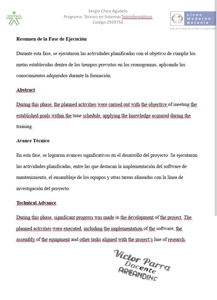 Anexo N°3/resumen y avance técnico fase de ejecución firmado por el docente de inglés/Tomada por Sergio Chico/9-05-2024